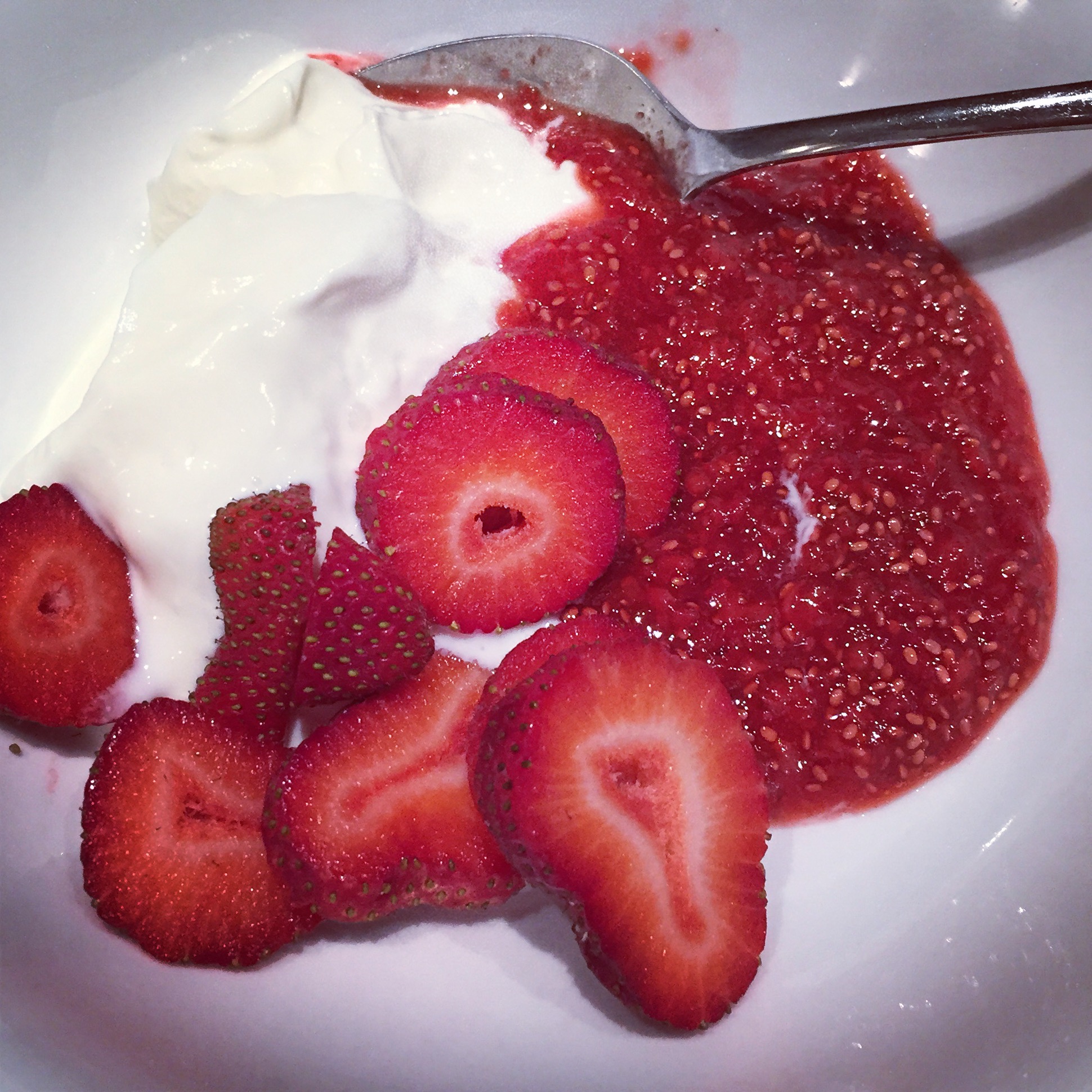 This is a delightful healthy jam which can be spread on your toast or mixed in with your yoghurt and granola. The chia seeds give it the wonderful jelly texture. This is a great way to use up half dead strawberries that you might find at the back of your fridge!